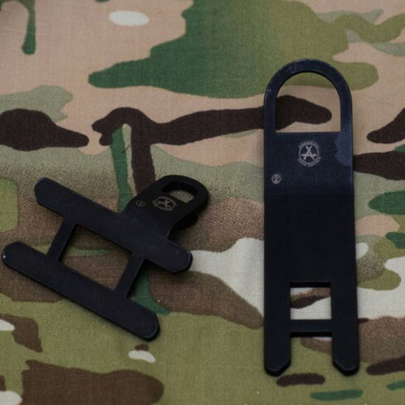 Вторая антабка более универсальна, она называется "назад-вниз". Такая антабка позволит носить оружие на ремне не зависимо от того сложен приклад или разложен. Изгиб подобран таким образом, что можно пристегнуть карабин любого ремня, но при этом антабка не мешает стрельбе. Вот такие простые, но довольно удобные железки.