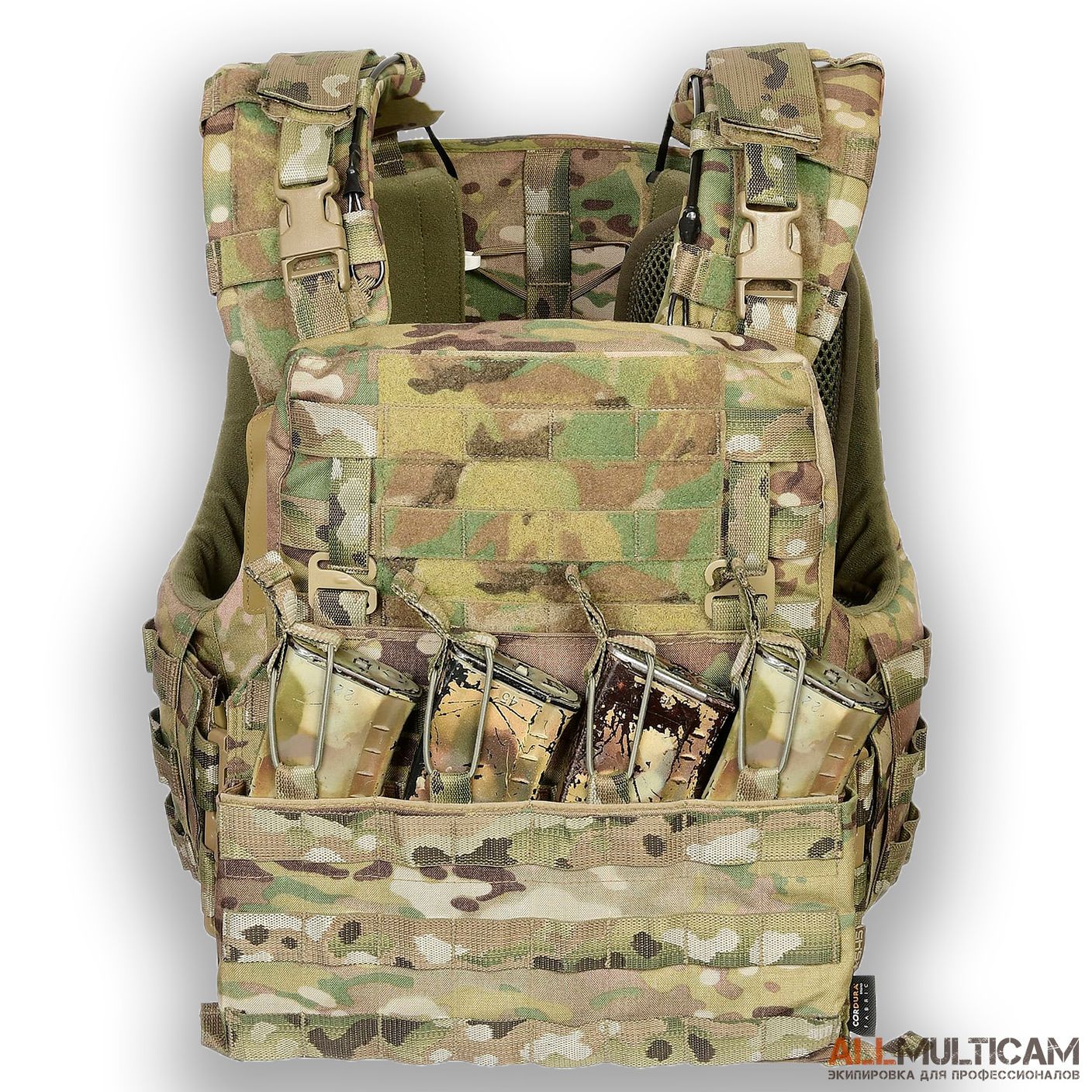 - Впереди изделия присутствует накладная панель, способная вмещать 4 стандартных магазина. В местах примыкания приклада оружия имеется специальная вставка, благодаря которой приклад не скользит и не давит. Конструкция и место крепления чехла фронтальной плиты не создаёт препятствий для ведения огня.