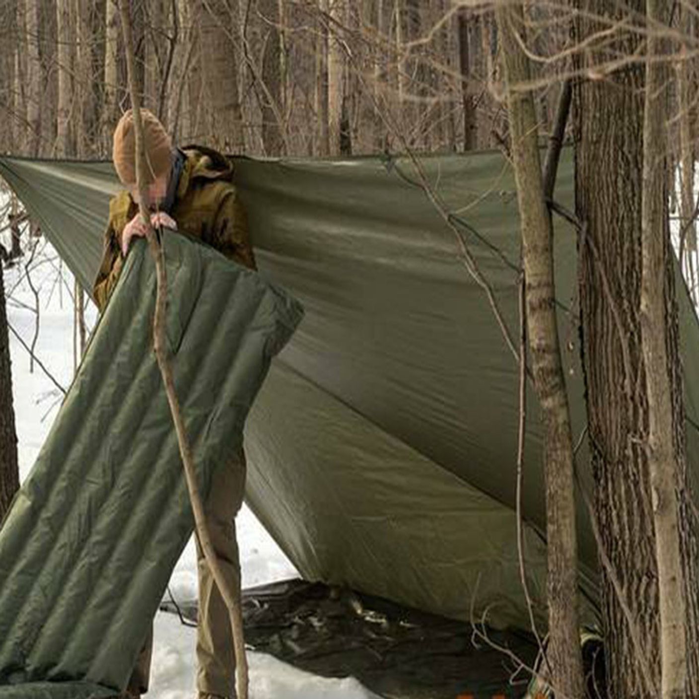 На дно как раз и укладывается коврик. А на коврик - спальник. При этом получается хорошая защита от дождя и ветра, а если развести перед тентом костер, то наклонная стенка будет играть роль экрана для тепла. Вообще тент 3х3 метра очень хороший вариант для легкоходной ночевки как универсальное аварийное укрытие в арсенале бушкрафтера и выживальщика. Также тент может использоваться для маскировки стоянки или закрывать лодку в грузовике. Воистину очень многоцелевая вещь.