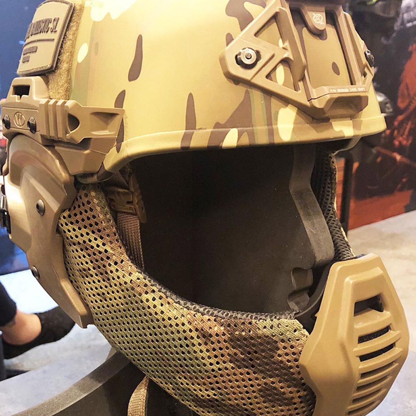 Новинка от компании Team Wendy, которая появится уже в марте 2019 года - баллистическая защита лица и подбородка. Универсальный подбородник Exfil Ballistic Mandible быстро крепится на рельсы EXFIL Rail 2.0 или 3.0 без дополнительного оборудования. Он защищает лицо и уши от осколков и ударов тупыми предметами. Подбородник сделан из вспененного полиэтилена с вентиляционными отверстиями. Он слегка гнется, поэтому частично может принимать форму челюсти. Боковые части покрыты сеткой, а передняя прочная вставка обеспечивает дополнительную защиту.