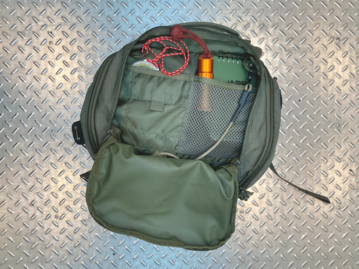 Осмотрев рюкзак снаружи, вы заметите множество вырезанных лазером ячеек MOLLE спереди и по бокам. Они идеально подходят для крепления дополнительных сумок или аксессуаров MOLLE. Под системой MOLLE спереди расположен плоский карман на молнии. Он достаточно просторный для документов формата А5 и других плоских предметов, требующих быстрого доступа. Для стока попавшей внутрь влаги в кармане предусмотрено дренажное отверстие.