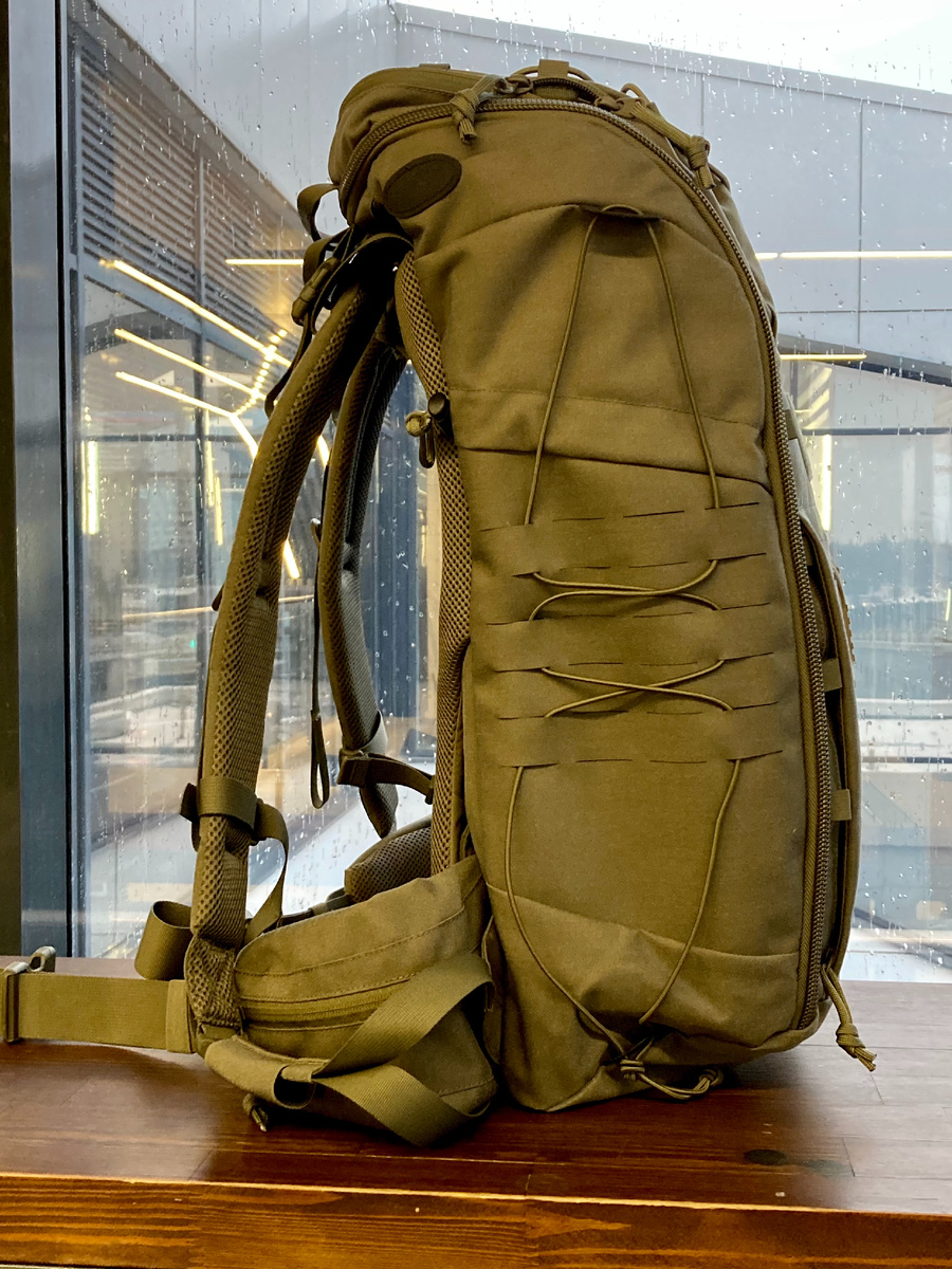 Боковые поверхности рюкзака тоже оснащены системой MOLLE с лазерной резкой (6 рядов по 4 ячейки с каждой стороны), регулировкой из паракорда и отверстиями для вывода гарнитуры, шланга гидратора и прочего. Паракордовый шнур, расположенный над панелями MOLLE, позволяет регулировать объём рюкзака путем стягивания и фиксации стоппером.